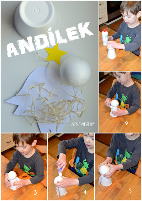 Na výrobu tohoto jednoduchého andílka budete potřebovat jen kelímek, vystřižená křídla a hvězdu na čelo, polystyrenovou kouli jako hlavu a pak něco, co bude představovat vlasy. Já použila tzv. dřevitou vlnu, která sloužila jako výplň jedné dárkové krabičky, kterou jsem dostala (ale stejně dobře se vám bude hodit režný provázek, vlna nebo vata). Já vše schovávám, protože vím, že se to jednou hodí. A zrovna tohle se mi hodilo již mnohokrát. Postup je úplně jednoduchý. Tavnou pistolí přilepte hlavičku na obrácený kelímek (lepidlem to špatně drží a hlavně dlouho schne), na záda pak nalepte obyčejným lepidlem křídla. Na hlavičku pak vlasy a na ně hvězdičku. To jde také dobře obyčejným lepidlem. A je hotovo.
